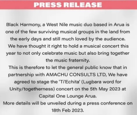 However, fans have frequently been asking the Black harmony for a music concert and finally the time has come for the westnile's music cream de la creme to showcase what they are known of come 5th of may at capital one lounge.
