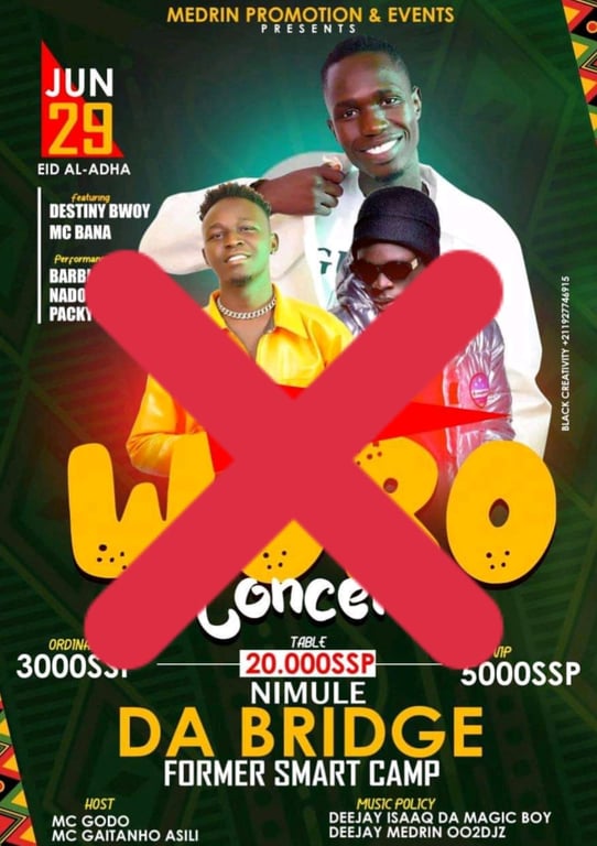 A concert dumbed Woro officially to be headlined by Siliboi T'los of BlackMoon entertainment featuring Destiny Bwoy and MC Bana was initially organised by the above promoter due on 29th June at Da Bridge Club in Nimule.
