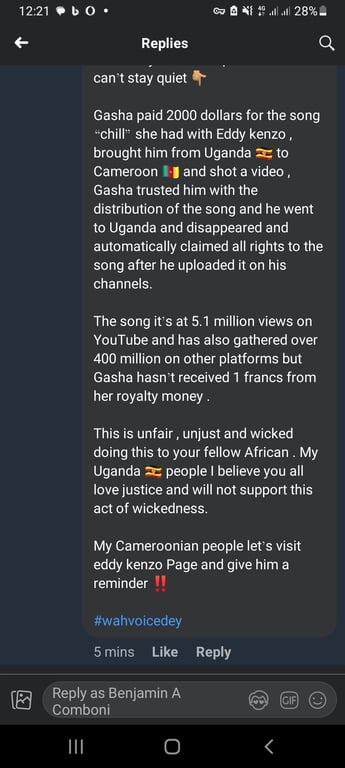 Gasha paid Eddy Kenzo a sum of 2000 U.S Dollars to travel to Cameron for a collaboration on a song titled "chill". Gasha later on entrusted Eddy Kenzo with the distribution of the song since he is the bigger brand .Eddy Kenzo however posted the song only his sole platforms and has since then enjoyed all the royalties coming in from the collaboration without forwarding a penny to Gasha . The song currently had 5.1 million views on YouTube.Gasha had been silent on the matter all along ,breaking the silence just of late after branding Kenzo a musical shark who is busy enjoying her millions.No official statement has yet been released by Eddy Kenzo in regards to the accusations.