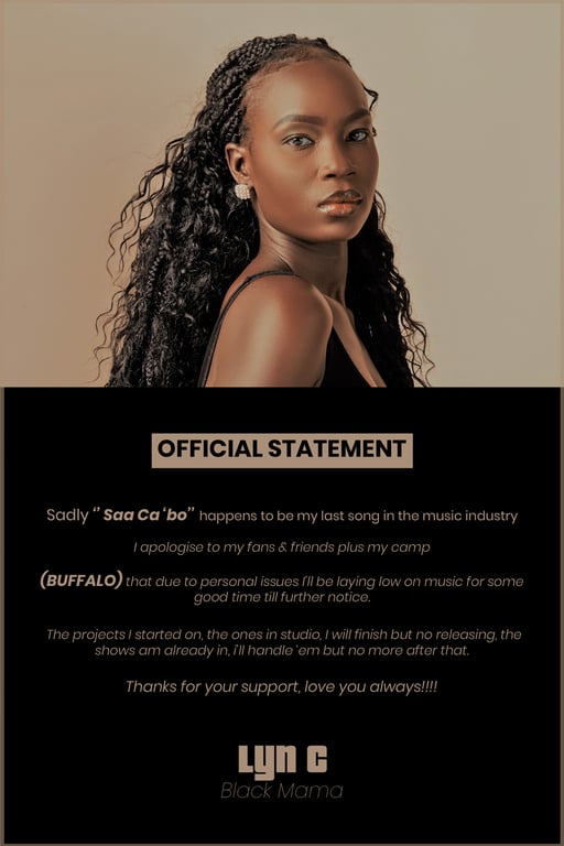 It looks like all has gone South for 𝐁𝐮𝐟𝐟𝐚𝐥𝐨 𝐜𝐚𝐦𝐩'𝐬 only songstress 𝐥𝐲𝐧 𝐜 𝐛𝐥𝐚𝐜𝐤 𝐦𝐚𝐦𝐚 as she has announced her exodus from active music with an immediate effect.